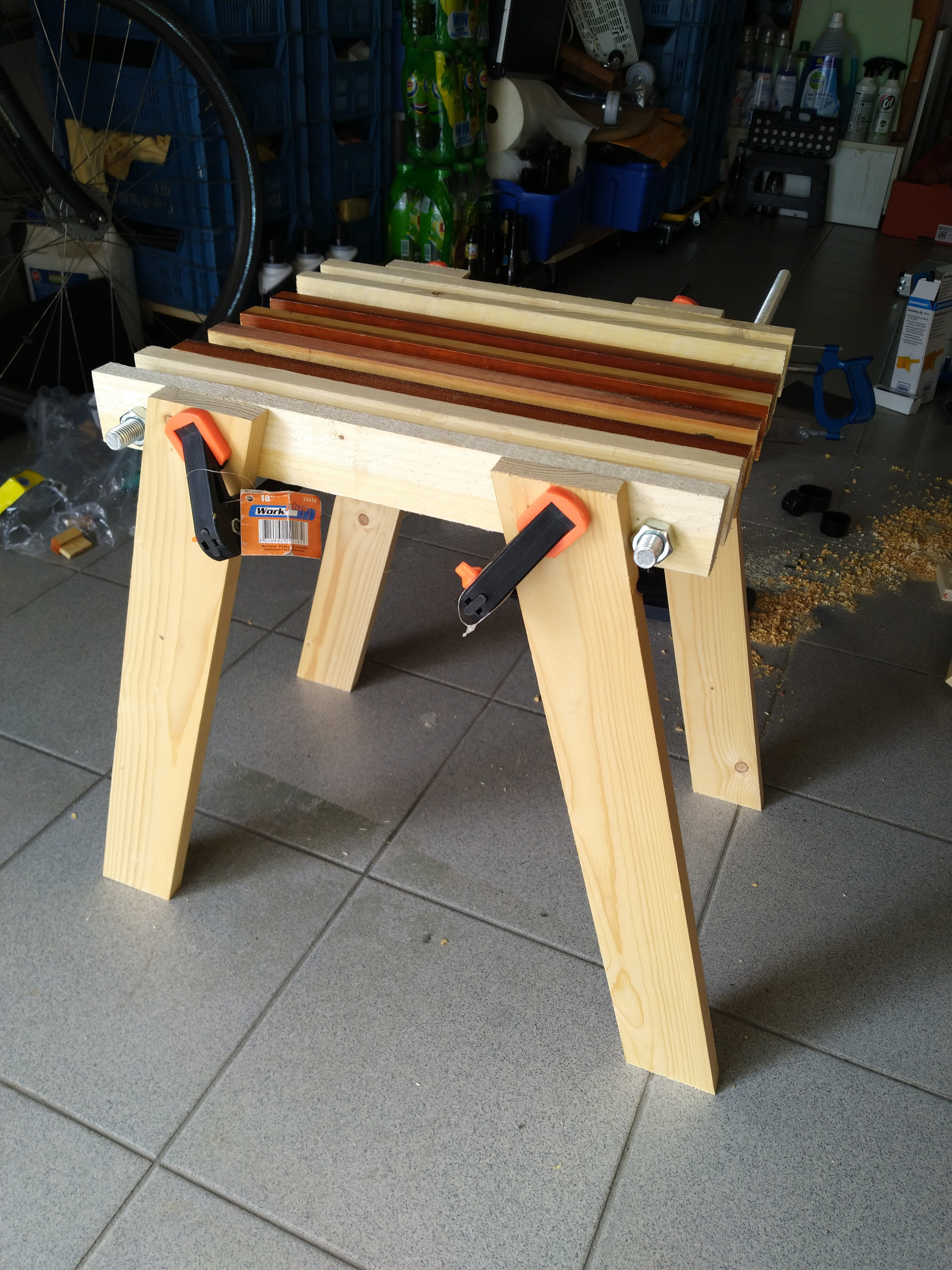 A little bench made out of scrap wood and some rods. There is also no glue used, so it's easy to take it apart later if we ever get tired of it.